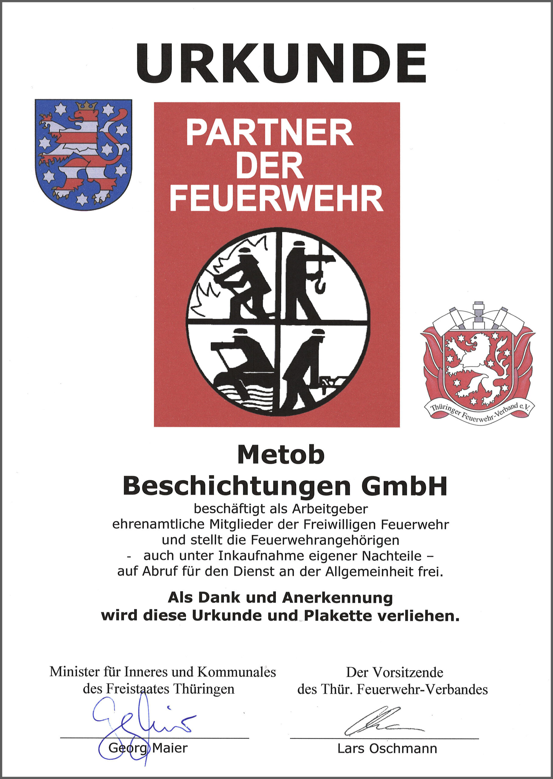 Der Standort Hildburghausen der Metob Beschichtungen GmbH wurde bei der diesjährigen Hauptversammlung der Feuerwehr Hildburghausen als „PARTNER DER FEUERWEHR“ geehrt.Read More