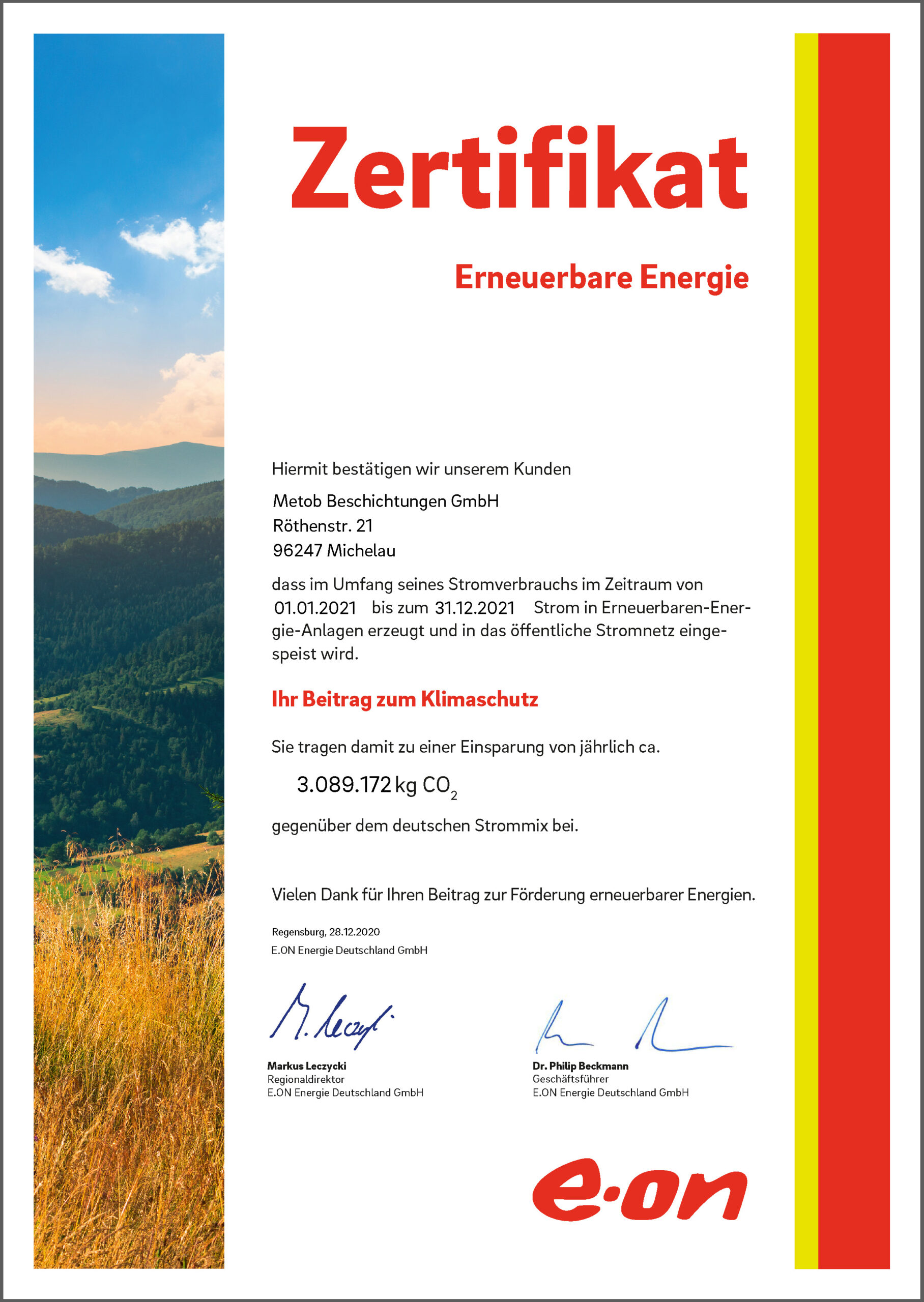 Zwischen der Metob Beschichtungen GmbH und der E.ON Energie Deutschland GmbH wurde vereinbart, dass der 2021 gelieferte Strom zu 100 % aus Erneuerbare-Energien-Anlagen gewonnen wird. Auf Basis des Stromverbrauchs 2020 können so 3.089.172 kg CO2 gegenüber dem deutschen Strommix eingespart werden. Um diese Menge CO2 zu kompensieren, müssten293.000 Bäume gepflanzt werden. Zusammen mit der Selbsterzeugung...Read More